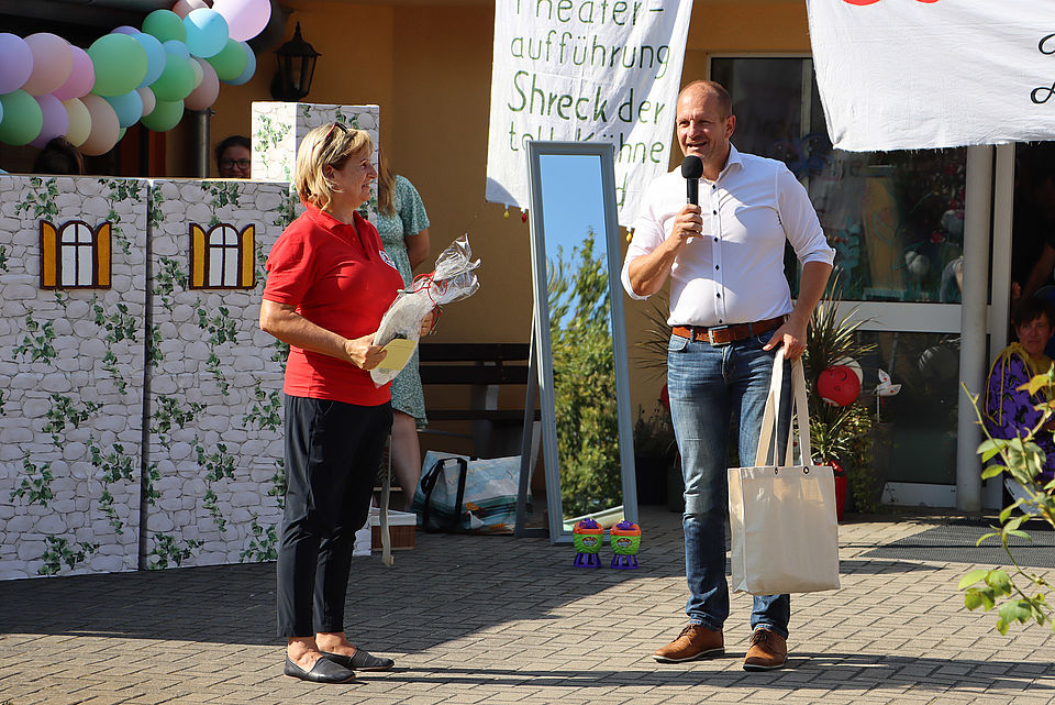 Einrichtungsleiterin Birgit Schleinig eröffnete das Fest und ließ in ihrer Rede die vergangenen Jahre, insbesondere die Anfänge Revue passieren, die sie maßgeblich mitgestaltete. Für ihr Engagement bedankten sich die Mitarbeiter der Einrichtung von Herzen bei ihr. Als Überraschung führten die Familienhelfer ein kleines Puppentheater auf und erzählten mit Witz und Charme den Werdegang von Birgit Schleinig. Ein weiteres Highlight war das Theaterstück "Shrek der tollkühne Held", welches Kinder und Erzieher präsentierten und damit das Publikum begeisterten.